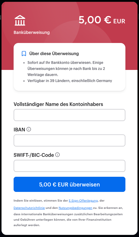 Klicken Sie auf „Einlösen“ auf der Einlöseseite und wählen Sie die Option für die Banküberweisung. Wenn der Absender Ihnen die Option für die Banküberweisung zur Verfügung gestellt hat, wird sie in der Liste der verfügbaren Optionen angezeigt.