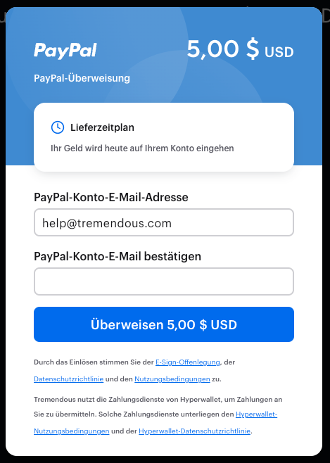 Wenn Sie sich in Indien befinden, müssen Sie möglicherweise die PayPal KYC-Verifizierung abschließen, bevor Sie eine PayPal-Auszahlung von Tremendous erhalten. Wenn die PayPal KYC-Verifizierung nicht abgeschlossen wurde, schlägt die Auszahlung fehl und wird an uns zurückgesendet.
