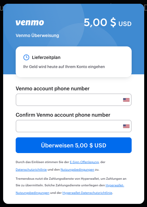 Venmo-Auszahlungen sind nur in den USA verfügbar. Wenn Sie nicht in den USA leben, wählen Sie bitte eine andere Auszahlungsoption.