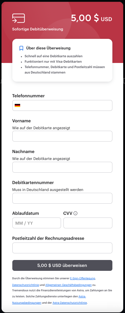 Sofortige Debitüberweisungs-Auszahlungen sind nur in den USA verfügbar. Wenn Sie nicht in den USA leben, wählen Sie bitte eine andere Auszahlungsoption.