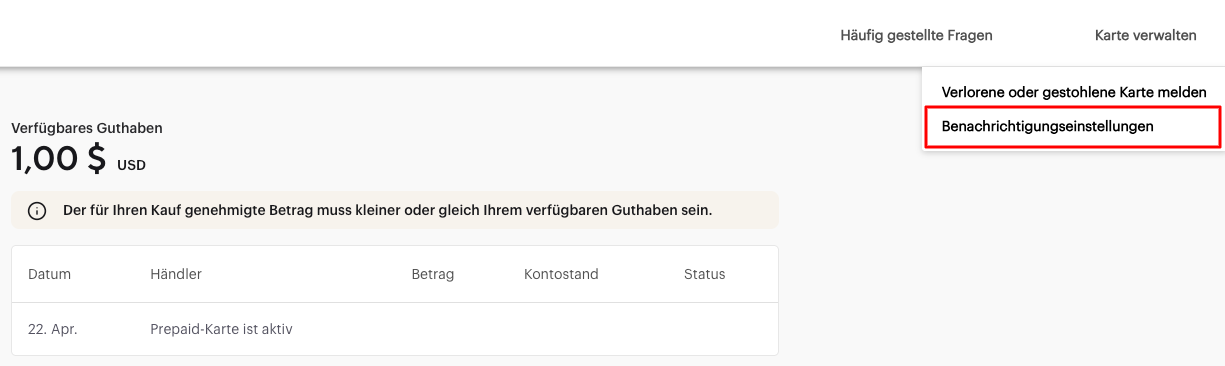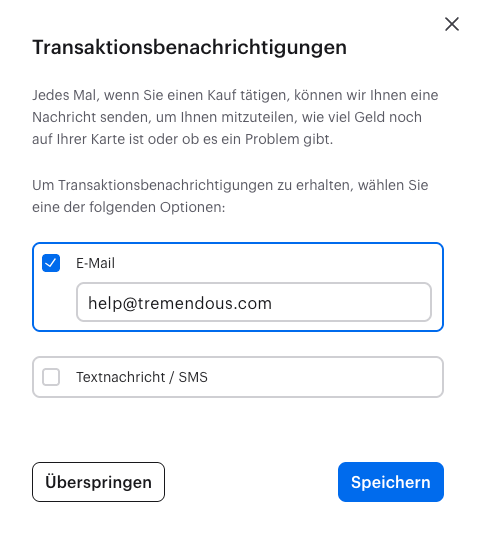 Sie können Benachrichtigungen an die E-Mail-Adresse oder Telefonnummer Ihrer Wahl erhalten. Sie können Benachrichtigungen auch ausschalten, wenn Sie keine Updates zu Ihrem Kartenguthaben und Ihren Transaktionen erhalten möchten.
