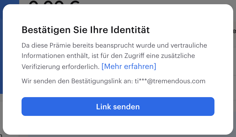 Nach dem Einlösen einer Link-Belohnung muss der Empfänger seine E-Mail bestätigen, um erneut darauf zugreifen zu können. Die Aufforderung sieht folgendermaßen aus: