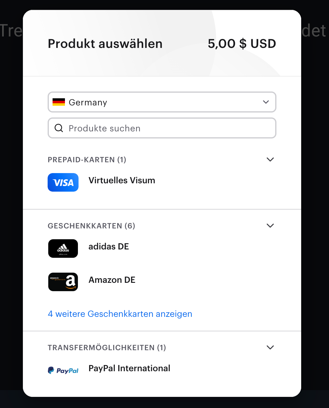 Wenn Sie Ihre persönlichen Informationen nicht eingeben möchten, können Sie Ihre Belohnung als Geschenkkarte einlösen. Es gibt über 1.000 Geschenkkartenoptionen, und Sie können Ihren Geschenkkartencode erhalten, ohne persönliche Informationen einzugeben.