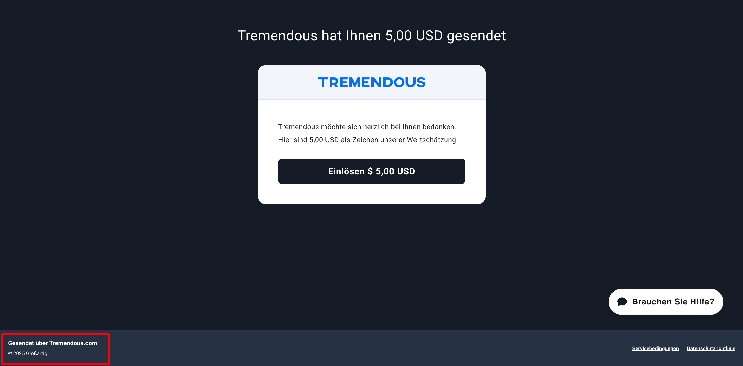 Wenn Sie auf den Link klicken, um Ihre Belohnung einzulösen, werden Sie zu einer URL mit diesem Präfix weitergeleitet: „reward.tremendous.com/rewards/“.