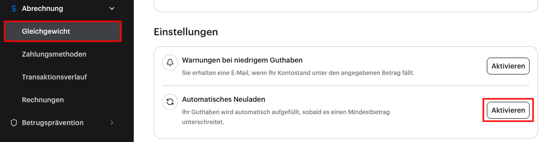 - Die automatische Aufladung wird nur einmal pro Tag ausgelöst. Wenn Ihr Guthaben an einem Tag zweimal unter den Mindestschwellenwert fällt, müssen Sie Ihr Guthaben manuell aufladen.