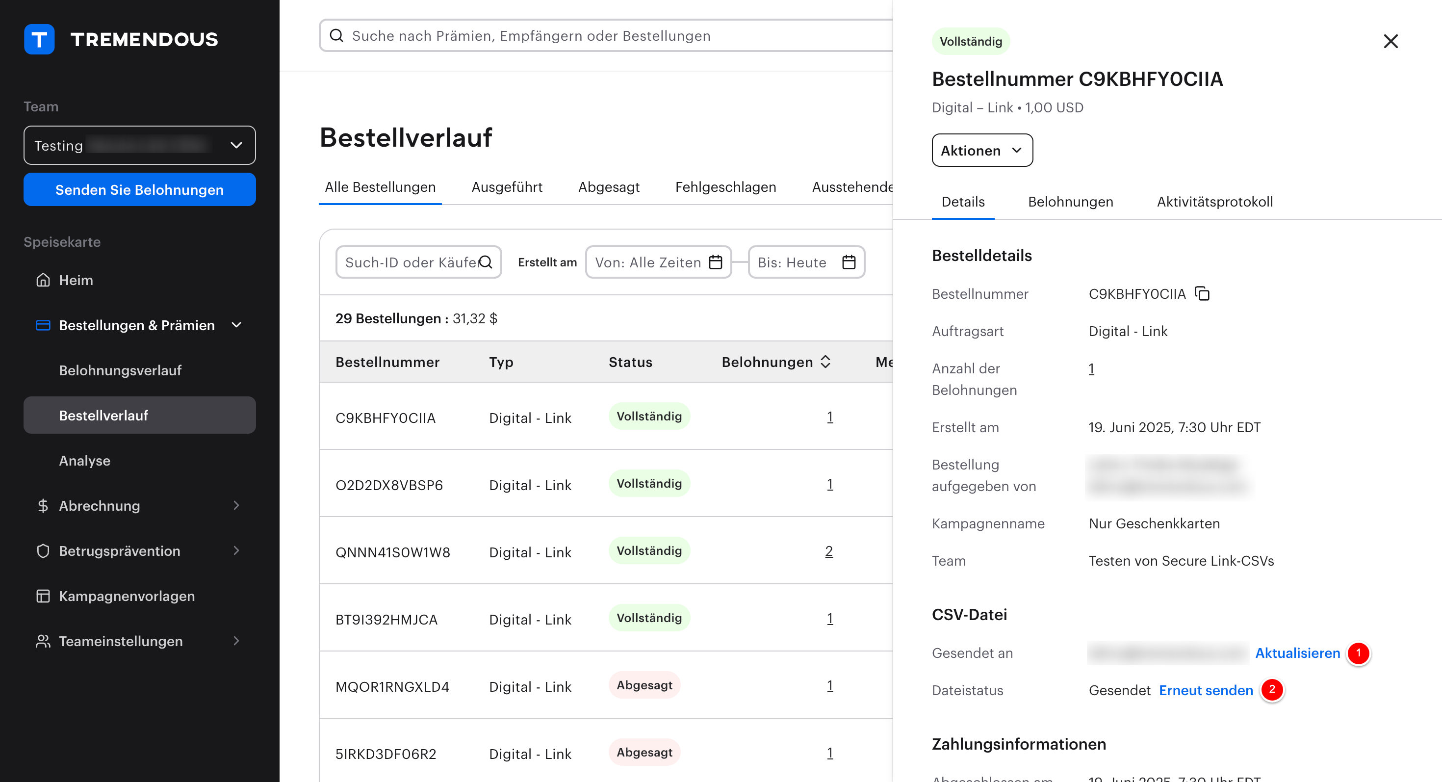 Aus Sicherheitsgründen können diese Aktionen bis zu insgesamt dreimal pro Bestellung durchgeführt werden. Für zusätzliche Unterstützung kontaktieren Sie bitte den Support unter clients@tremendous.com.