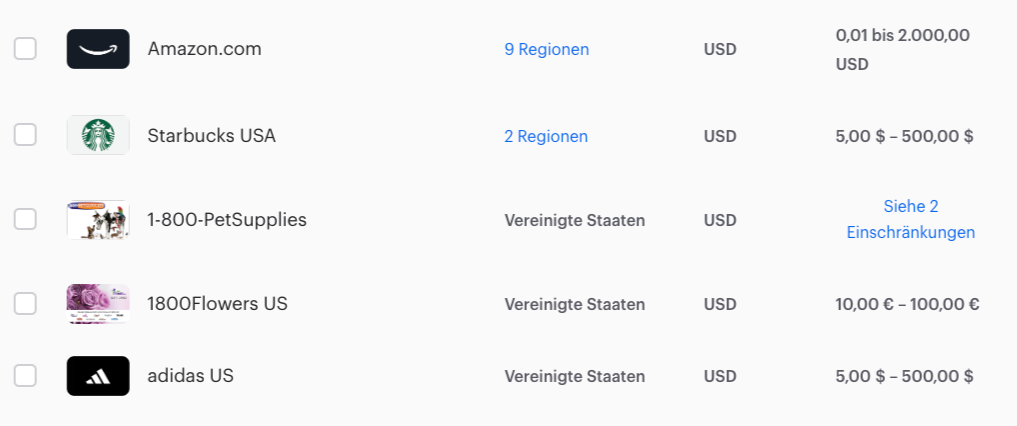 Zum Beispiel könnte eine Starbucks-Geschenkkarte nur für Belohnungen zwischen 5 $ und 500 $ verfügbar sein. Wenn die Belohnung eines Empfängers außerhalb dieses Bereichs liegt, wird Starbucks nicht als Einlöseoption angezeigt.
