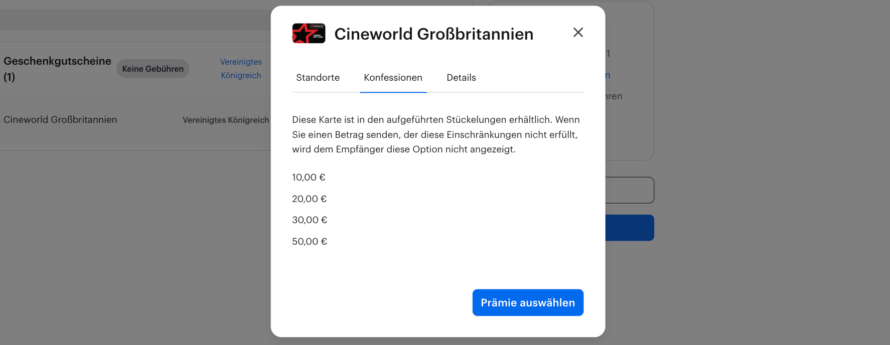 Zum Beispiel könnte eine Cineworld Großbritannien nur in Nennwerten von £10, £20, £30 oder £50 verfügbar sein. Wenn der Belohnungsbetrag des Empfängers nicht genau einem dieser Nennwerte entspricht, wird die Cineworld Großbritannien während der Einlösung nicht angezeigt.