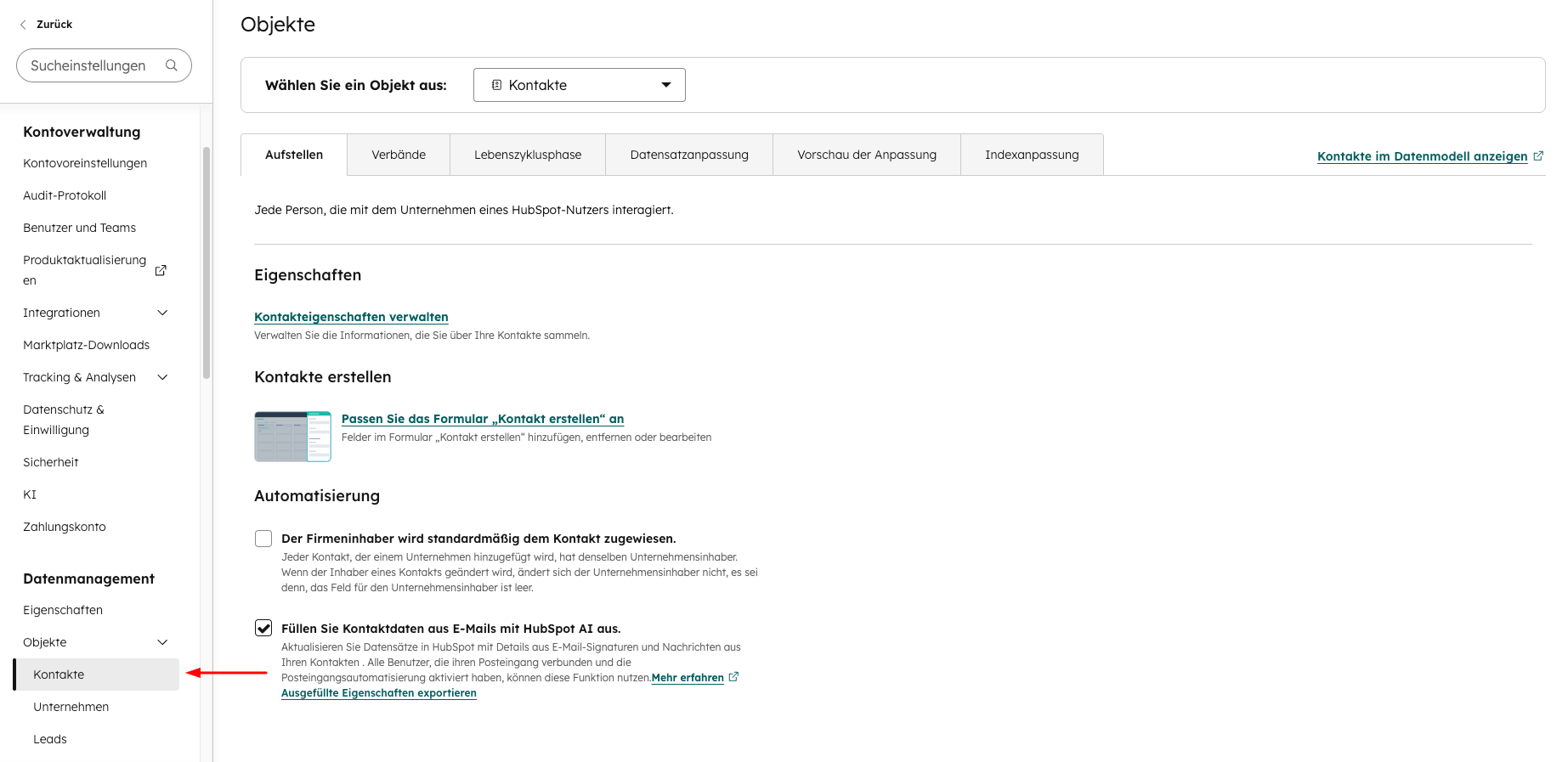 Gehen Sie zu Einstellungen > Datenmanagement > Objekte > Kontakte.