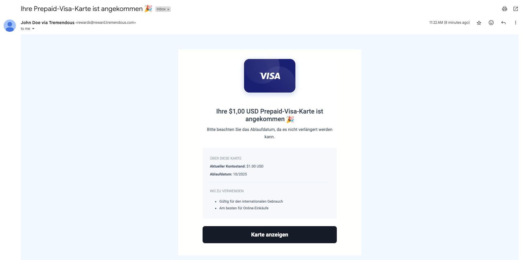 Ihre Karten-Seite ist über die E-Mail zugänglich, die Sie erhalten haben. Wenn Sie Ihre Belohnungs-E-Mail nicht finden können, senden Sie bitte eine E-Mail an help@tremendous.com.