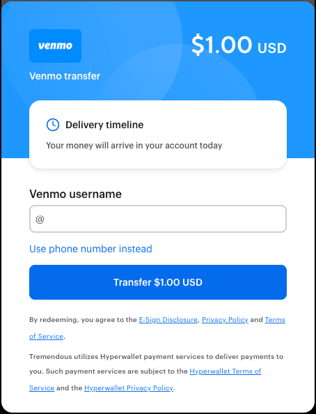 Click “Redeem” on the redemption page and choose the Venmo payout option. If the sender has made the Venmo payout option available to you, you’ll see it in the list of available options.