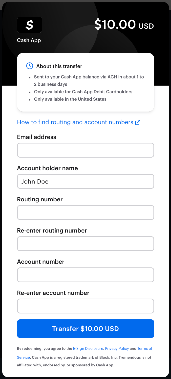 Enter the accountholder name, routing number, and account number associated with your Cash App account. You’ll be prompted to enter your routing and account numbers twice to ensure accuracy. Once you are certain your information has been entered accurately, click Transfer.