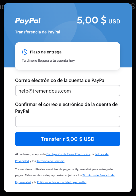 Si se encuentra en India, es posible que deba completar la verificación KYC de PayPal antes de recibir un pago de PayPal de Tremendous. Si la verificación KYC de PayPal no se ha completado, el pago fallará y será devuelto a nosotros.