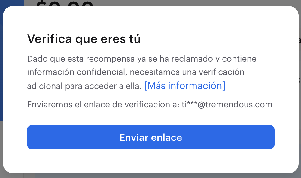 Después de reclamar una recompensa de enlace, el destinatario necesitará confirmar su correo electrónico para acceder a ella nuevamente. La solicitud se verá así:
