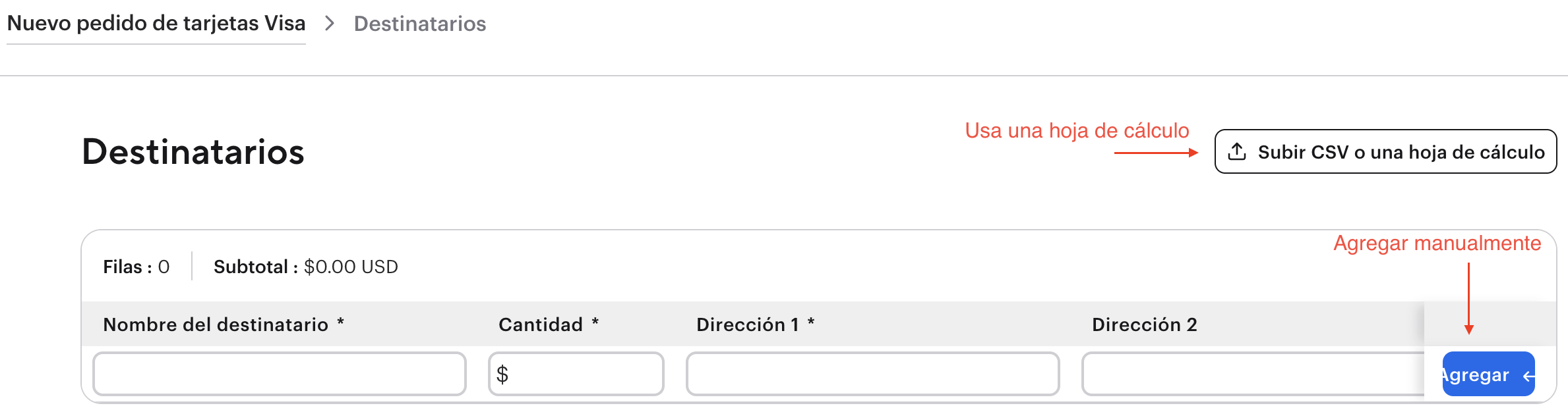 Las tarjetas Visa Direct tienen una tarifa asociada de $2 por tarjeta, que se aplica al costo total de tu pedido al finalizar la compra.