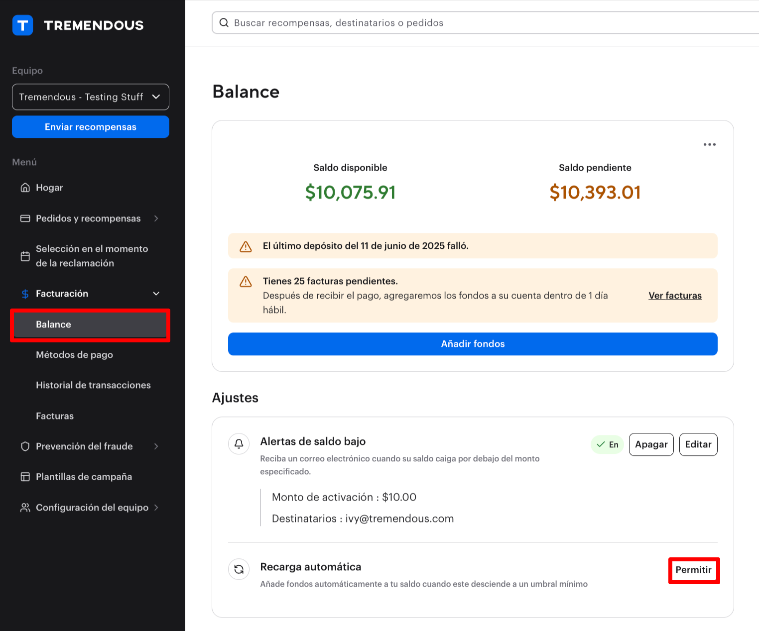 - Si un pago de recarga automática falla o es rechazado por tu banco, la recarga automática se desactivará. Si esto ocurre, por favor contacta a clients@tremendous.com para obtener asistencia.