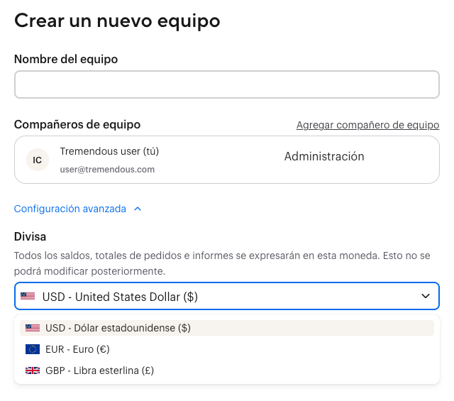 Al crear un nuevo equipo, puede establecer la moneda del equipo. Todos los saldos, totales de pedidos e informes estarán en la moneda que seleccione.