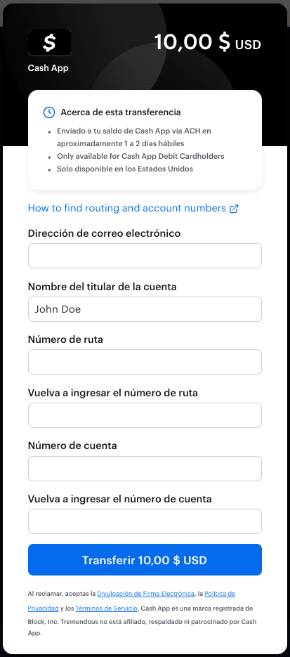 Ingrese el nombre del titular de la cuenta, el número de ruta y el número de cuenta asociados con su cuenta de Cash App. Se le pedirá que ingrese sus números de ruta y de cuenta dos veces para garantizar la precisión. Una vez que esté seguro de que su información ha sido ingresada correctamente, haga clic en Transferir.