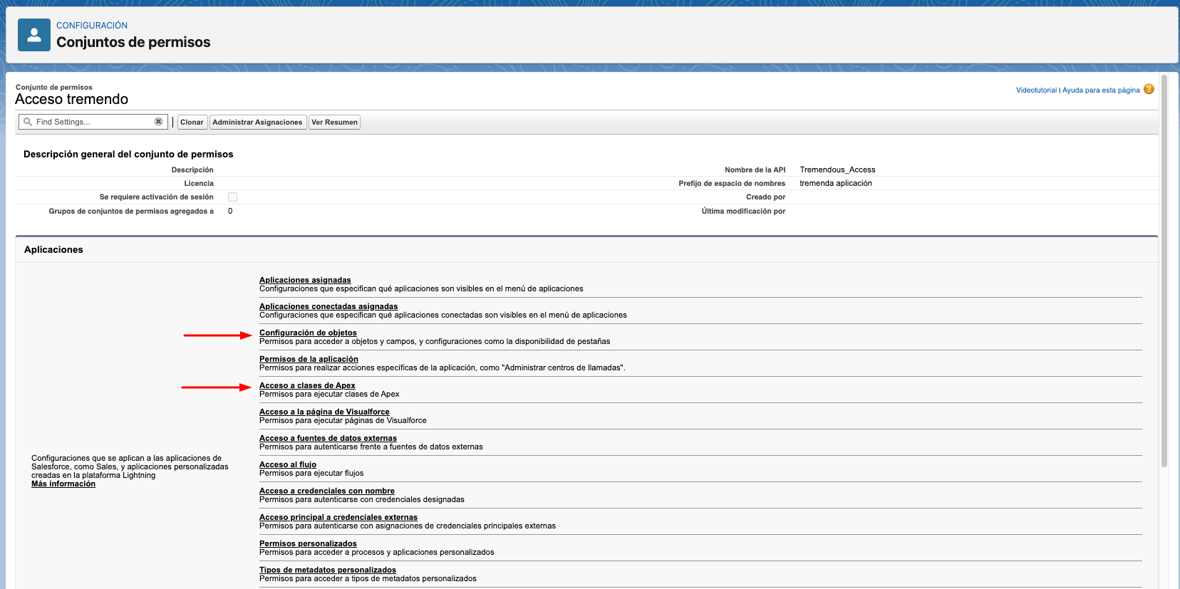5. Dentro de tu conjunto de permisos, configura los Ajustes de Objeto y el Acceso a Clases Apex: