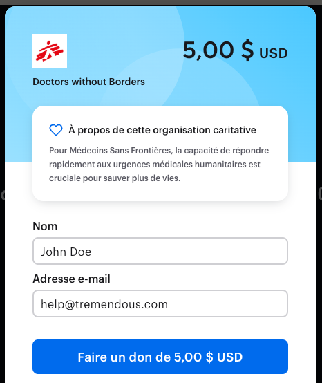 Entrez les informations requises. Vous devez fournir votre nom et votre adresse e-mail pour échanger un don de charité. Une fois que vous êtes certain que vos informations ont été saisies correctement, cliquez sur Faire un don.