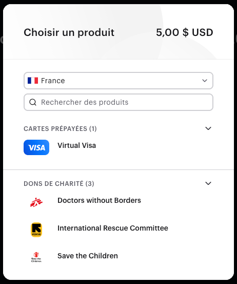 Cliquez sur « Réclamer » sur la page de rédemption et choisissez votre organisation caritative préférée. Si l'expéditeur a mis des dons de charité à votre disposition, vous les verrez dans la liste des options disponibles.