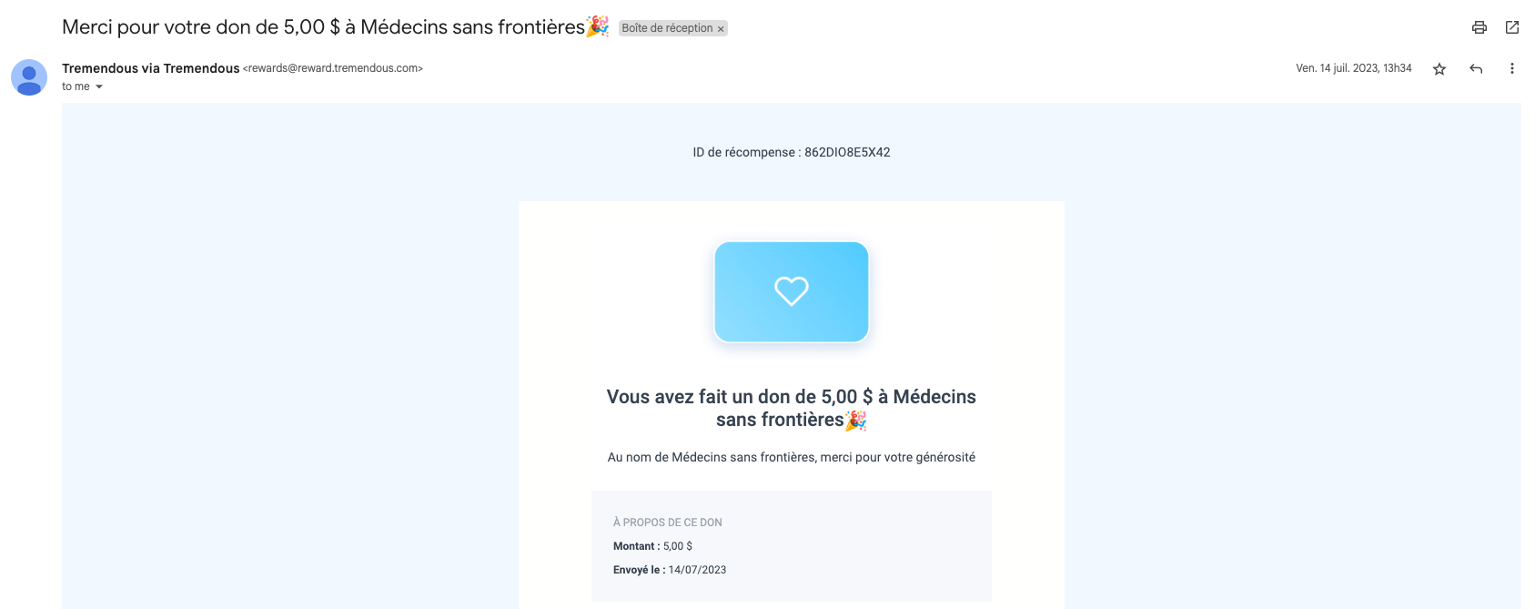Trouvez l'email envoyé depuis rewards@reward.tremendous.com dans votre boîte de réception, ouvrez-le et cliquez sur le bouton « Réclamer ». Votre récompense peut également avoir été envoyée par SMS ou sous forme de lien par l'émetteur de la récompense. Si vous avez des difficultés à localiser votre récompense, veuillez envoyer un email à help@tremendous.com.