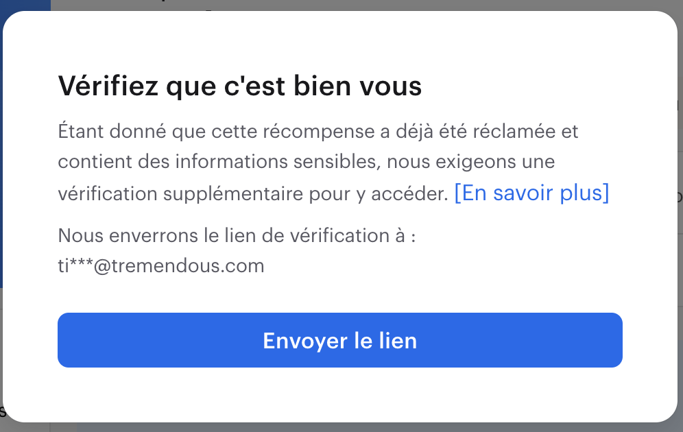 Après avoir réclamé une récompense par lien, le destinataire devra confirmer son email pour y accéder à nouveau. L'invite ressemblera à ceci :