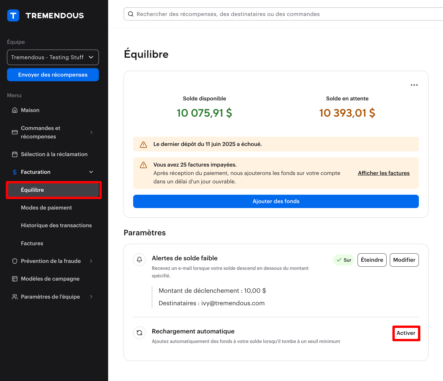 Si vous avez envoyé plus de 5 000 $ en récompenses, le rechargement automatique sera disponible pour maintenir votre solde de préfinancement. Le rechargement automatique peut être configuré dans l'onglet Facturation > Solde de votre tableau de bord.