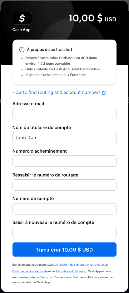 Entrez le nom du titulaire du compte, le numéro d'acheminement et le numéro de compte associés à votre compte Cash App. Vous serez invité à entrer vos numéros d'acheminement et de compte deux fois pour garantir l'exactitude. Une fois que vous êtes certain que vos informations ont été saisies correctement, cliquez sur Transférer.