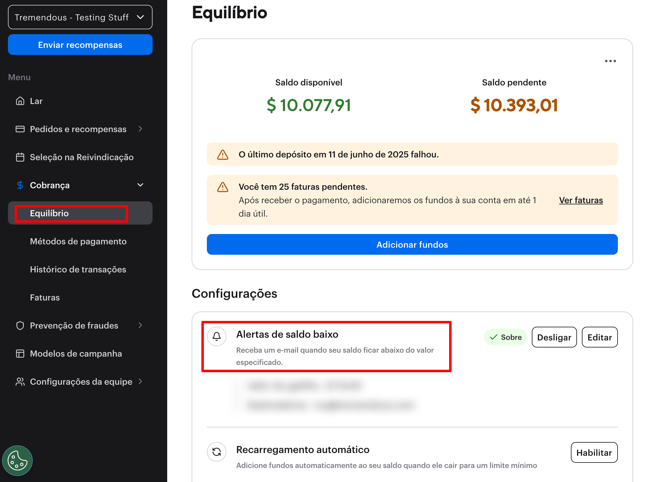 Para ativar notificações de saldo baixo, navegue até Faturação > Saldo no painel de controlo da Tremendous.