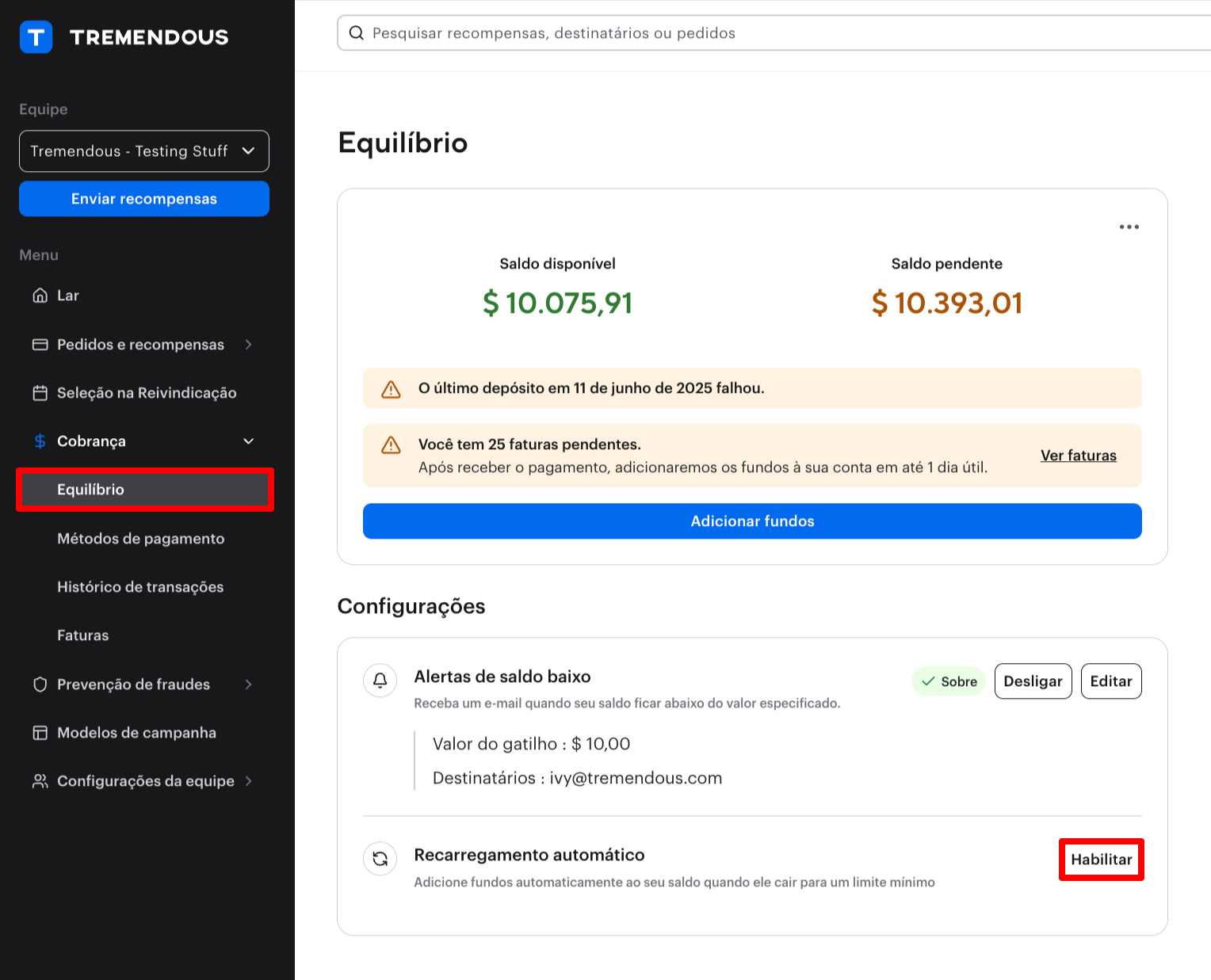 - Se um pagamento de recarga automática falhar ou for rejeitado pelo seu banco, a recarga automática será desativada. Se isto acontecer, por favor contacte clients@tremendous.com para assistência.