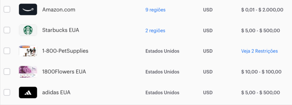 Por exemplo, um cartão de oferta Starbucks pode estar disponível apenas para recompensas entre $5 e $500. Se a recompensa de um destinatário estiver fora deste intervalo, o Starbucks não aparecerá como uma opção de redenção.