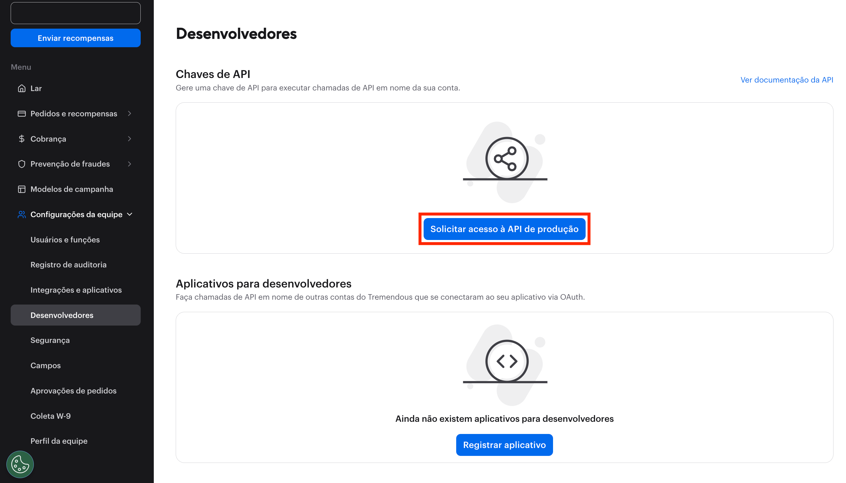 - Navegue até Configurações da equipa > Desenvolvedores e clique em Solicitar acesso à API de produção.