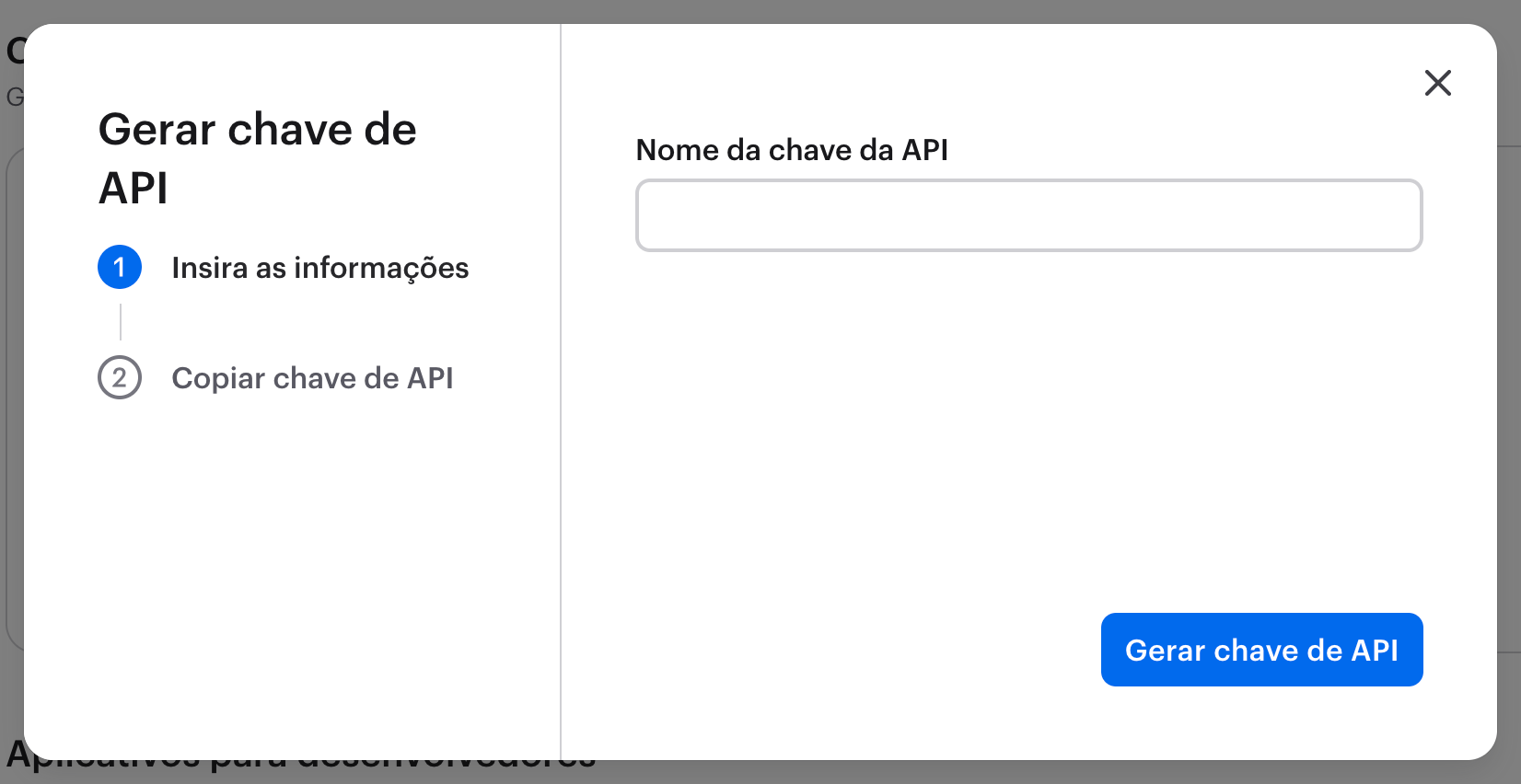 Insira e confirme o nome da sua chave de API. Isto irá gerar um token visível uma única vez que deverá copiar e colar na sua aplicação para posteriormente emitir pedidos de API.