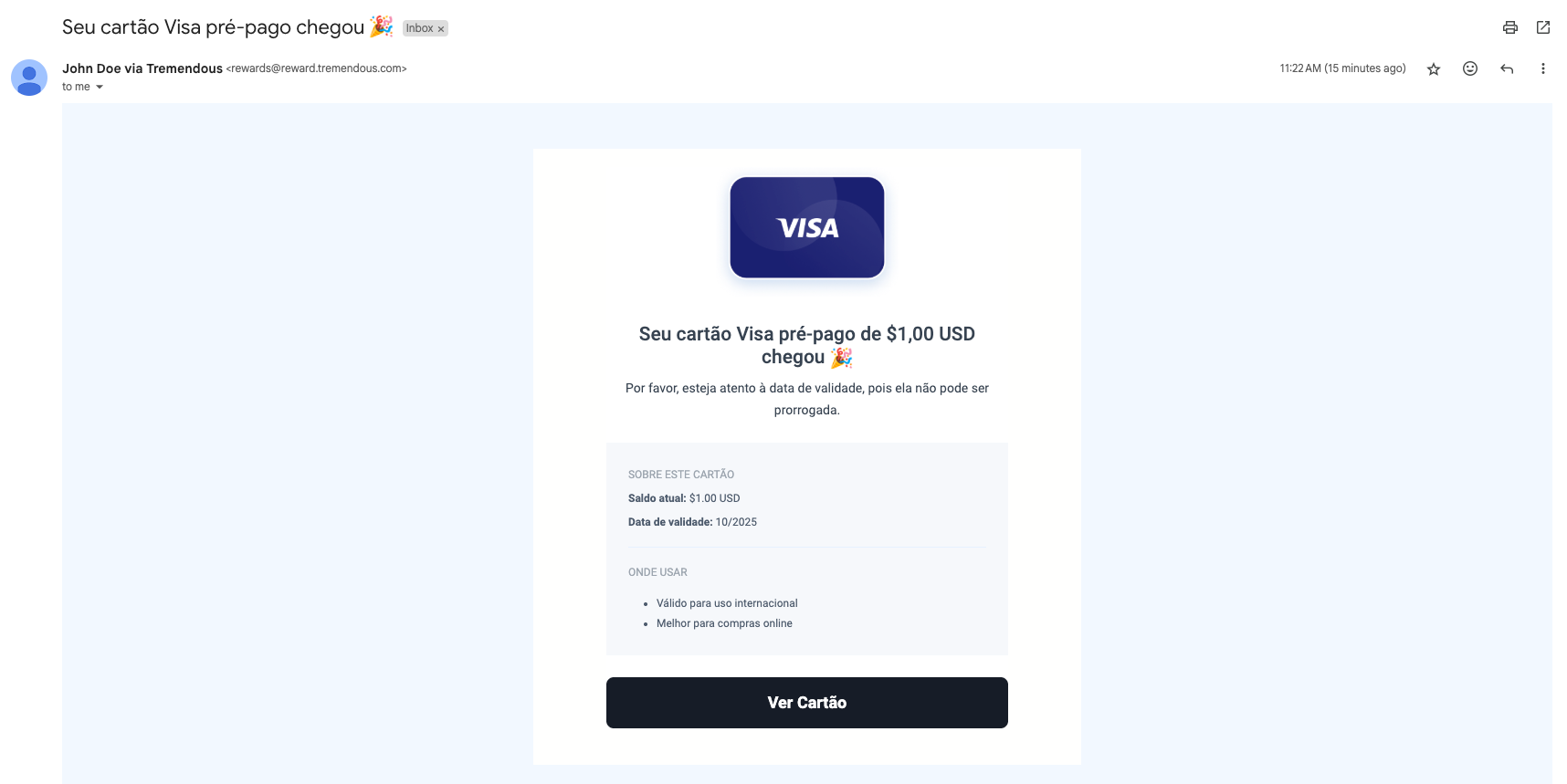 A página do seu cartão é acessível através do e-mail que você recebeu. Se você não encontrar o e-mail de recompensa, envie um e-mail para help@tremendous.com.