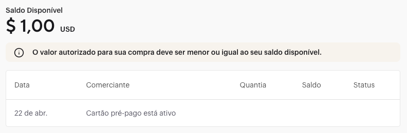 O saldo disponível do seu cartão é exibido no topo da página do cartão. Seu histórico de transações é listado abaixo.